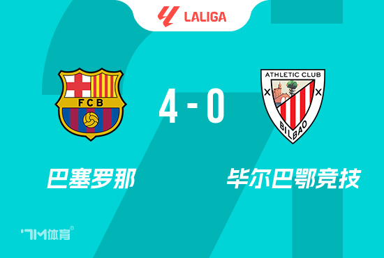 下半场伤停补时2分钟,全场比赛结束,最终巴萨4-0毕尔巴鄂竞技。