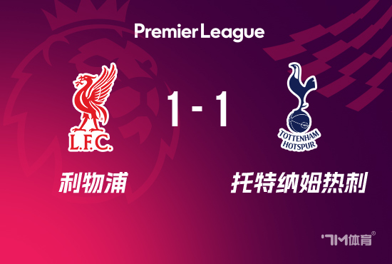 下半场伤停补时5分钟,全场比赛结束,最终利物浦1-1热刺。